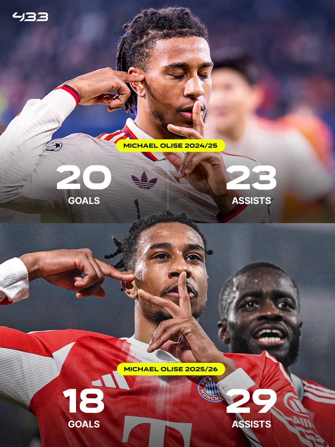 上赛季交出20+23的双20成绩单,而目前截止目前已有18+29的更强成绩单。考虑到拜仁还有欧冠,德国杯和德甲的至少7场比赛的情形来看,奥利塞本赛季很有可能达成的是进球20和助攻30的超级个人数据了