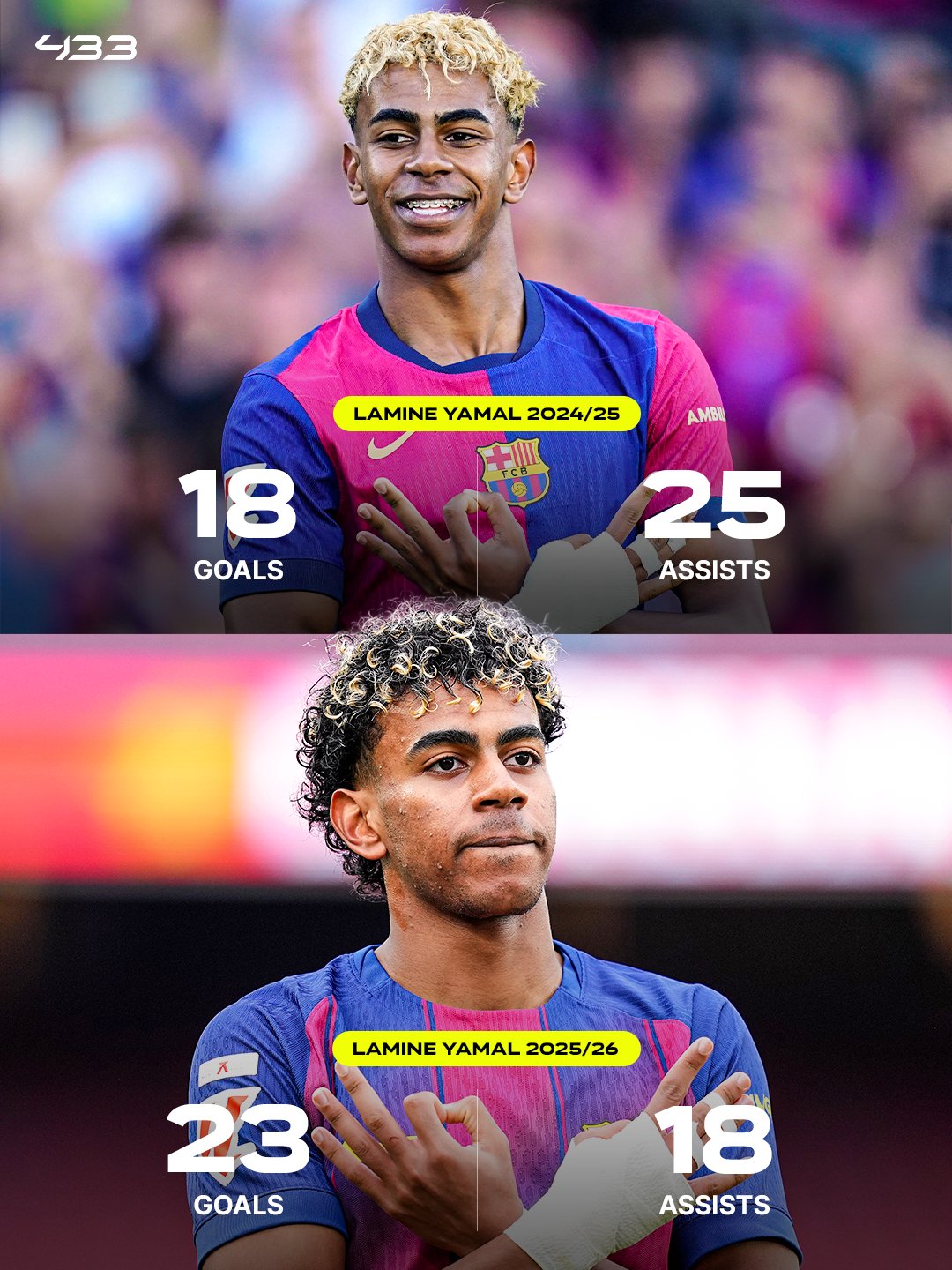 上赛季的亚马尔,达成了18+25的成绩单。而在本赛季,亚马尔的进球能力有了显著提升,目前已经有了23球18助攻的接近双20的成绩单。